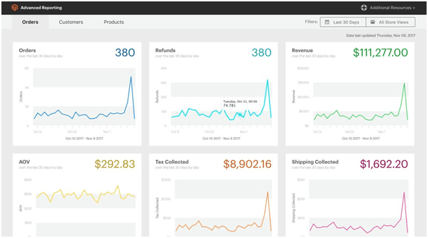 Now, merchants can get 20 insightful reports on order data, product sales, and customer behavior. Magento Business Intelligence creates reports and delivers data for: