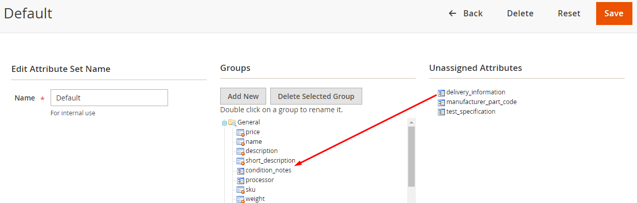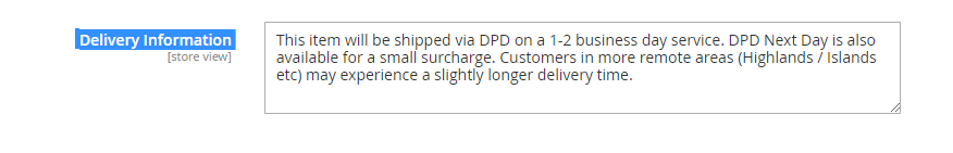 Now you can see the new attribute delivery_information on the product edit page. Update the attribute set and click on Save.