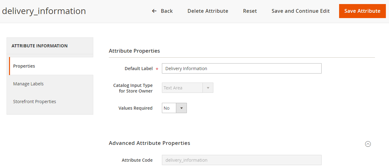 Set Default label as and Attribute Code as delivery_information. Now click on Save Attribute.
