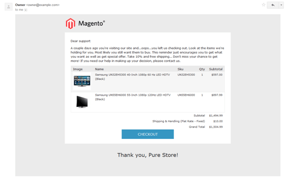 We offer automated email solution to enable Magento merchants to recover their lost revenue. It is possible to draft a friendly and engaging mail campaign to bring your shoppers back to your site to complete their purchase.