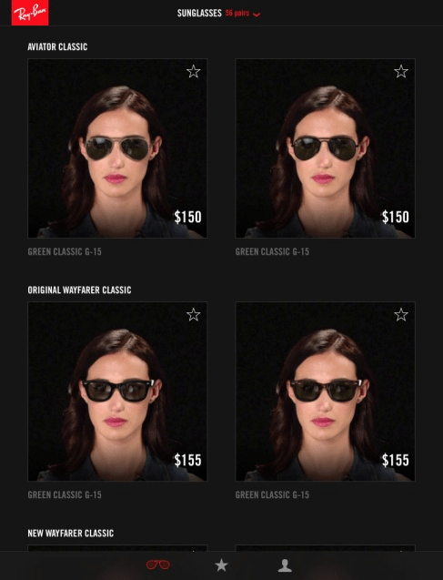 Ray-Ban, a well-known sunglasses, and eyewear brand uses AR and face mapping technologies to allow customers to preview glasses. Below is the image, you can see that customer creates a virtual model and then try the chosen glasses on to see how they will look on their face.