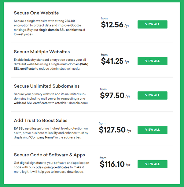 SSL certificates are used to secure credit card transactions, digital data transfer & login-registration credentials. It is necessary for an eCommerce store to have the SSL because eCommerce sites are all about digital transactions. Major hosting plans don’t have SSL option, thus you need to opt for it separately. Below image will help you to understand how much an SSL can cost for a single site, multiple sites, or multiple subdomains etc?