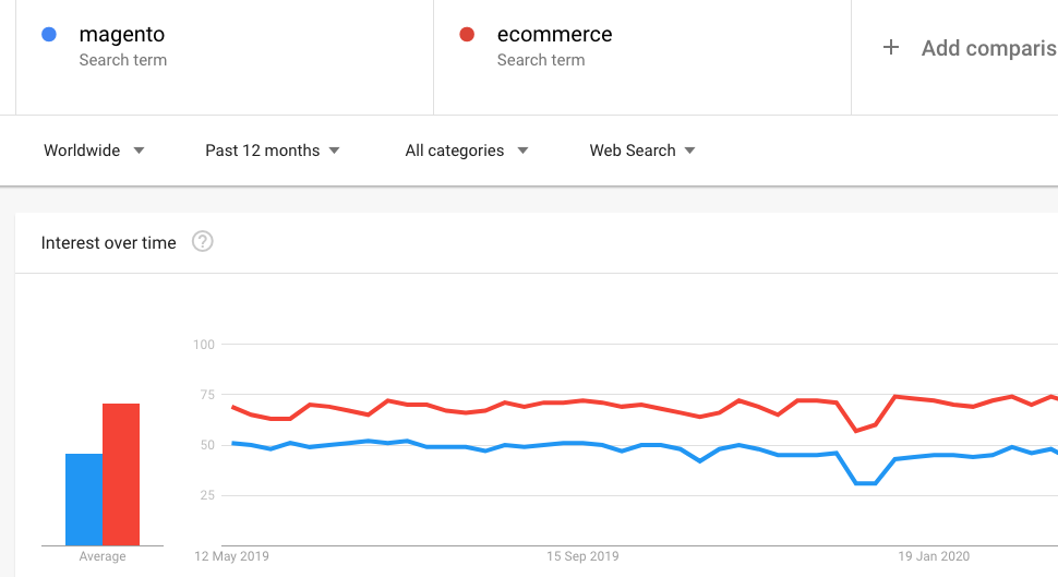 From the above statistics, you can say that the word “Magento” is searched on Google is more often than the word “Ecommerce” since 2008 which does not surprise us at all.