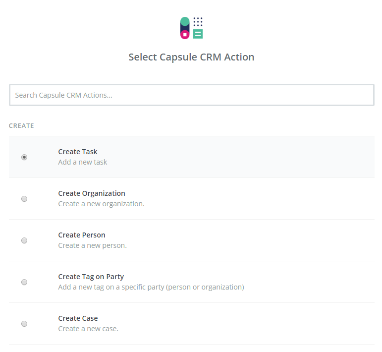Then, you need to choose one of the options from the drop-down list of Select Capsule CRM Action field. After, making your selection click on continue.