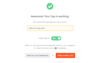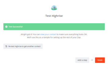 - Now, you have tested Highrise successfully. Finally, click on Finish and then set the name of your zap to complete.