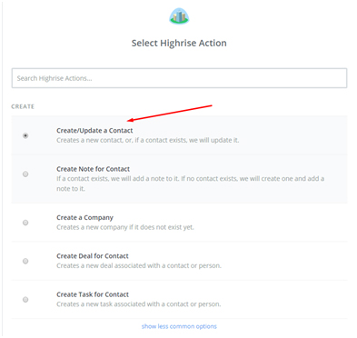 - Now, in select Highrise Action( as you can see below), you have to select on create/update contact and then click on continue