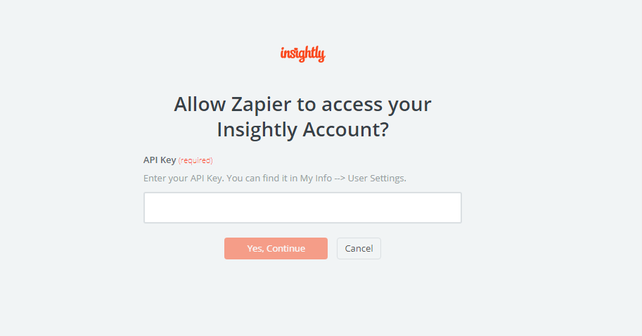 - Next, you need to select Insightly account. So, click on Connect an Account.Your screen will display as an image below, then, enter your API key from your account and click on Yes, Continue.