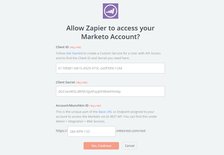 - Here you have to enter your account and find Client ID, Client secret in your Marketo account. Then, click on Yes, continue.