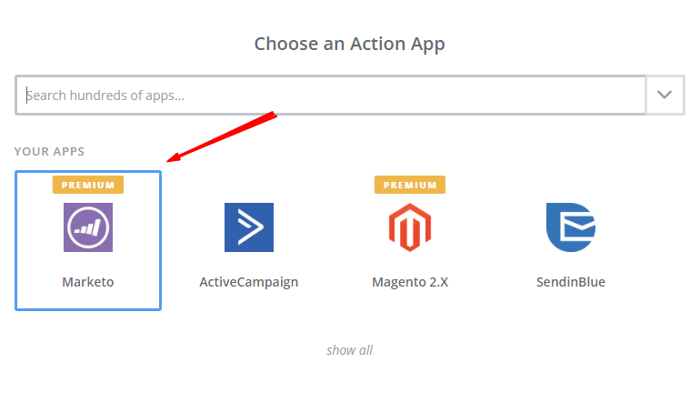 In Choose an Action App field, choose Marketo and then click on Continue.