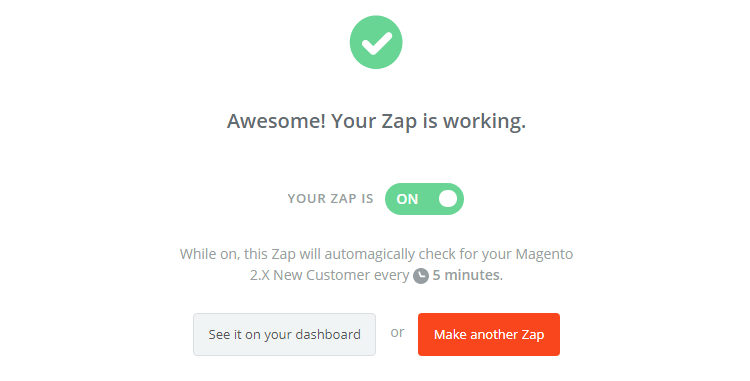 - From now onwards, your Zap is working and it will auto-check for your Magento 2.x new customer.
