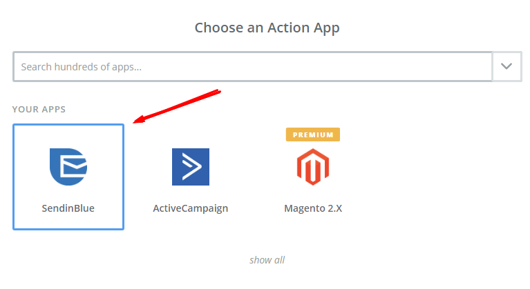 Next, In Choose an Action App field, choose SendinBlue and click on Continue.