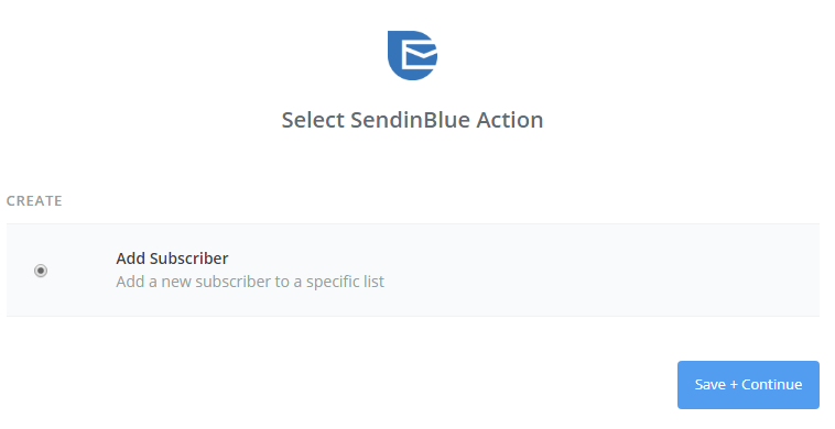 Then, choose Add Subscriber in the Select SendinBlue Action field and click on continue.