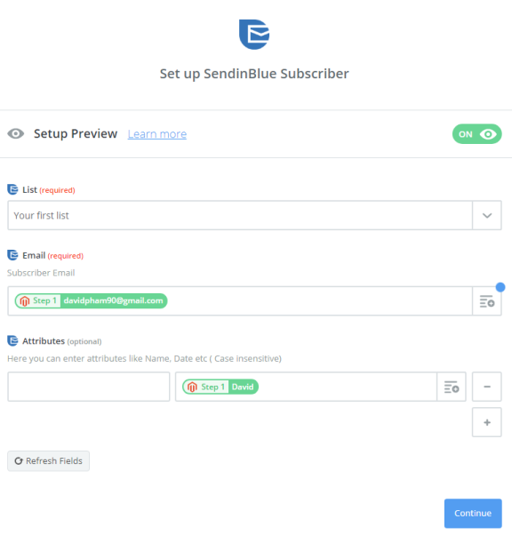 Next, you must Set up SendinBlue Subscribe for that you have to enter all requirement as well as the information of customers such as Email that you have created from your Magento 2 store, then choose continue box.