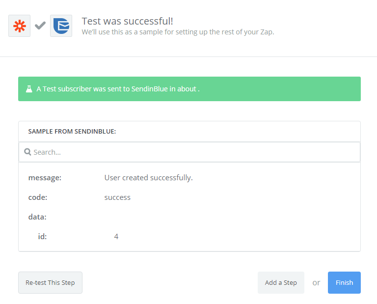 Congratulations, you have tested SendinBlue successfully. Finally, choose Finish and set the name your zap to complete.