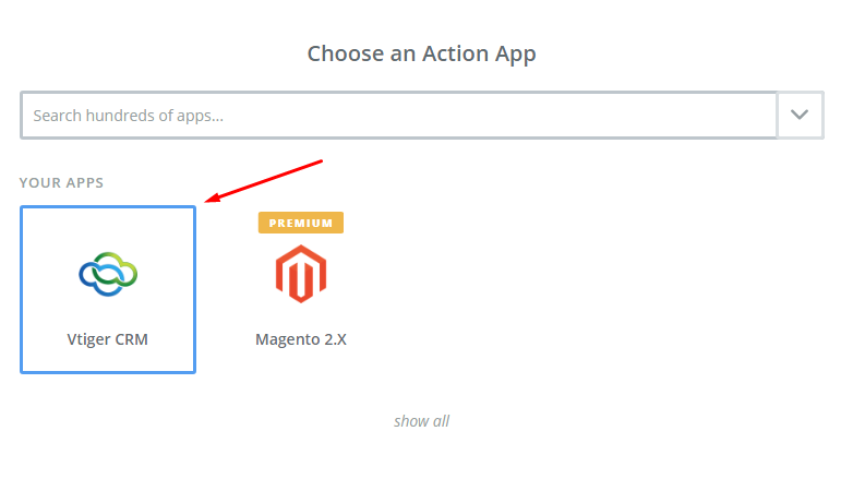 - In Choose an Action App field, choose Vtiger CRM and then click on Continue.
