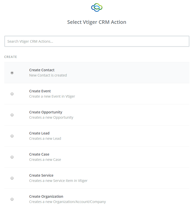 - Then, you need to choose one of the options from the drop-down list of Select Vtiger CRM Action field. After selecting, click on continue.
