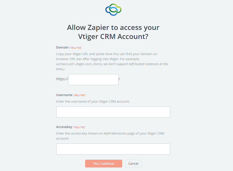- Now, your screen will display as the following image. Next, make sure to enter Domain, Username and AccessKey that is found on the Vtiger CRM account, then click on Yes, Continue.