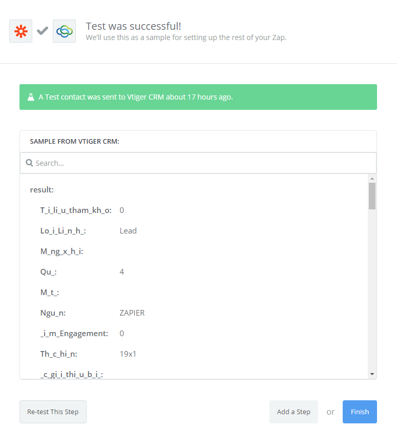 - Wonderful, you have tested Vtiger CRM successfully. A Test contact was sent to Vtiger CRM. Finally, choose Finish and set the name your zap to complete.