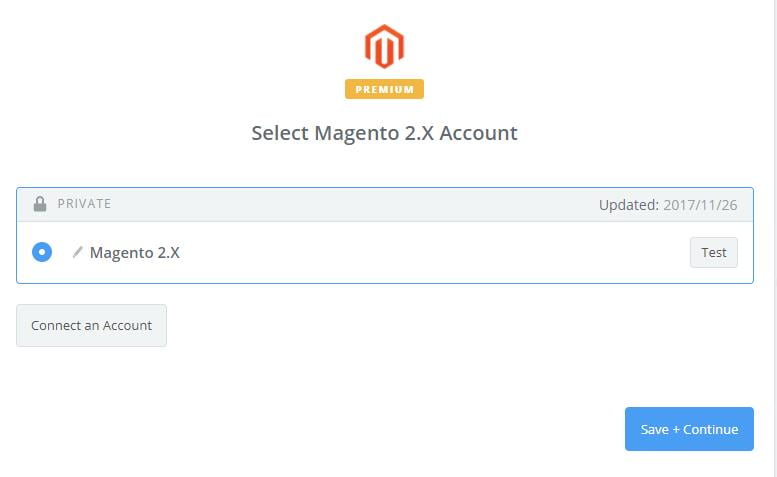 Now here you have to connect an Account in select Magento 2.x account field. In this step, make sure to enter full domain, admin username and admin password of your Magento 2 store as the image below: