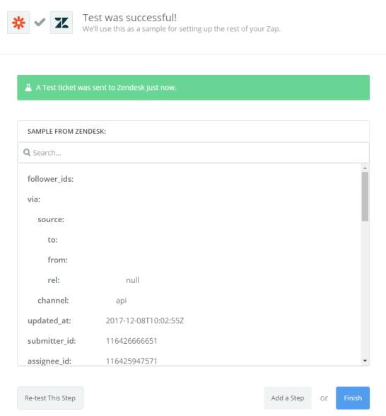 Perfect, you have tested Zendesk successfully. Finally, choose Finish and set the name your zap to complete.