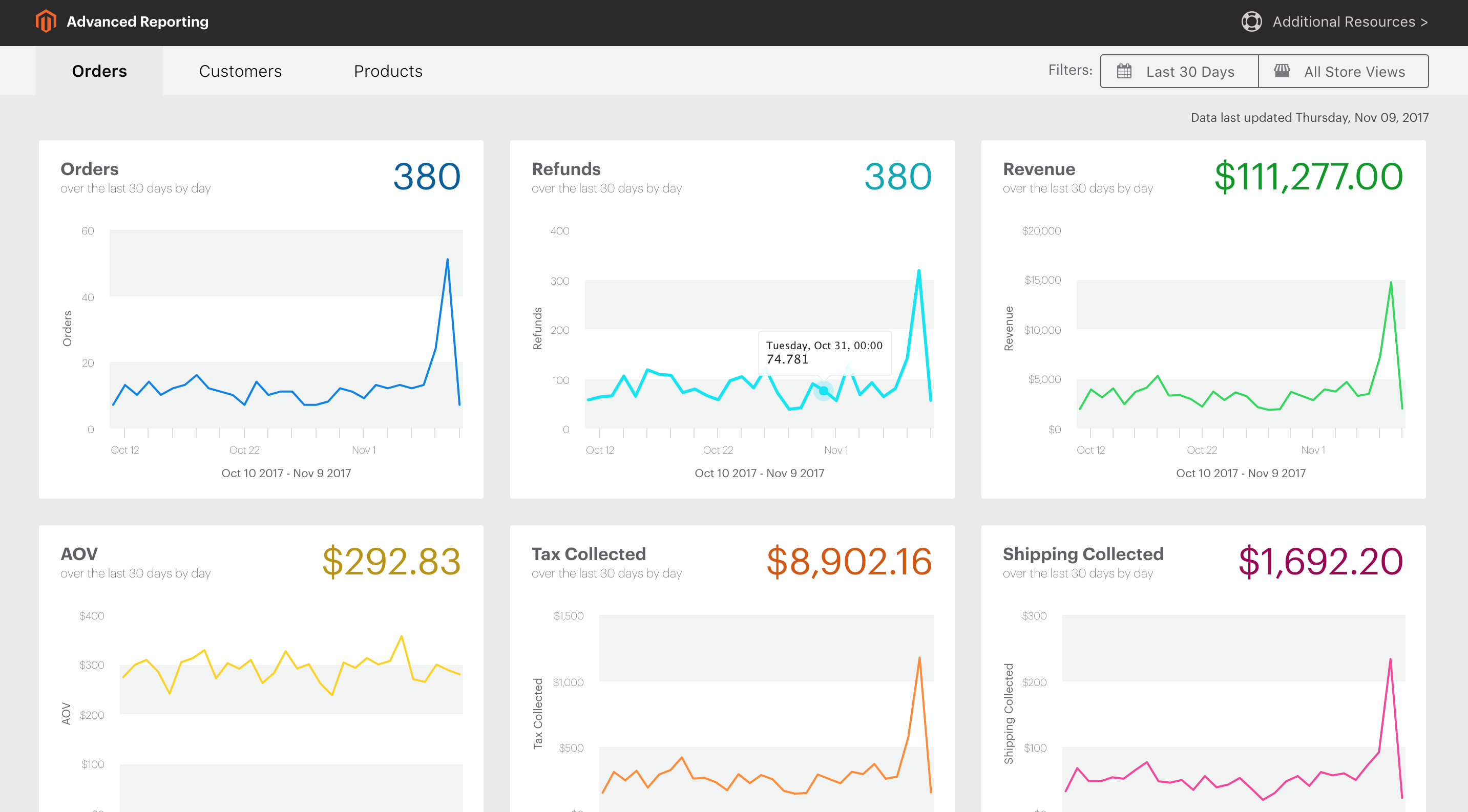 Data is updated daily and reports can be configured to show different date ranges – from a single day to 2 years. Merchants can also filter reports by store view. With reports expressly designed for business users, featuring vital metrics and great visualization, Magento customers now have the power to better manage their businesses.
