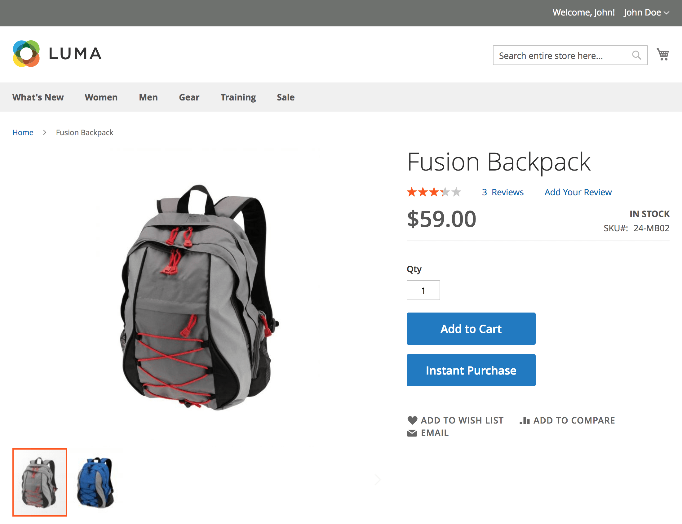 The new Instant Purchase feature provides returning customers with a faster checkout experience by using previously-stored payment credentials and shipping information to skip checkout steps. When a customer selects the “Instant Purchase” button on a product detail page, they are immediately taken to a confirmation page where they can place the order. There’s no need to enter their address, payment information, or shipping preference. Magento takes care of all of that.