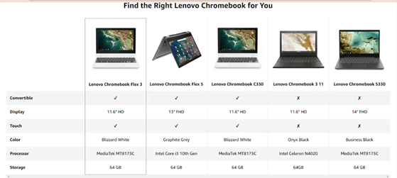 Product comparison example at Amazon: